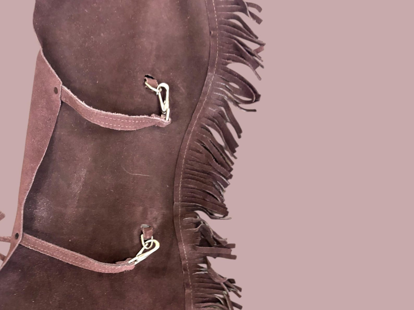These personalized Kid's size suede leather chap and vest outfit with fringe is adorable. The Chaps feature personalized back, front tie and snap hook adjustments on legs. Accented with silver conchos.