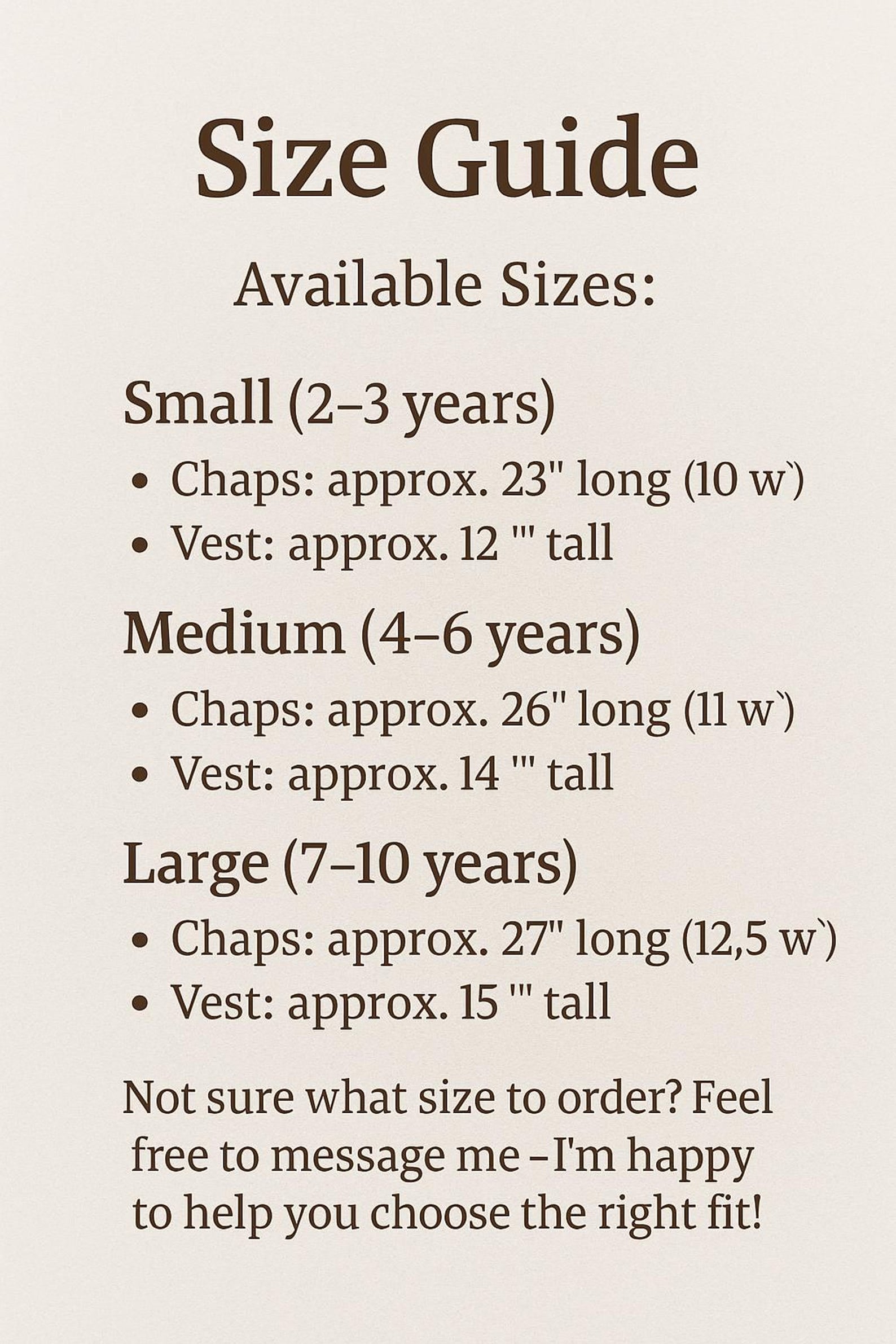 Small: Measurements are approx From top of leather at hip to bottom of Fringe 23" long. From across side to side of chaps is approx 10" measuring fringe edge. The vest measure approx 12"